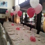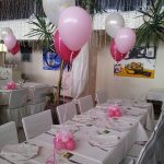 - Arreglos de mesa con bases de globos, lazos, confeti y pétalos que decoran sin recargar.