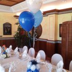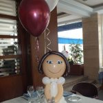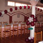 - Centros de mesa con globos de helio: combinaciones de 2 a 3 globos con un globo principal “Mi Primera Comunión”.