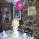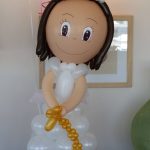 - Muñecos de globos hechos a mano (niño o niña), vestidos con traje o vestido blanco y un pequeño rosario.
