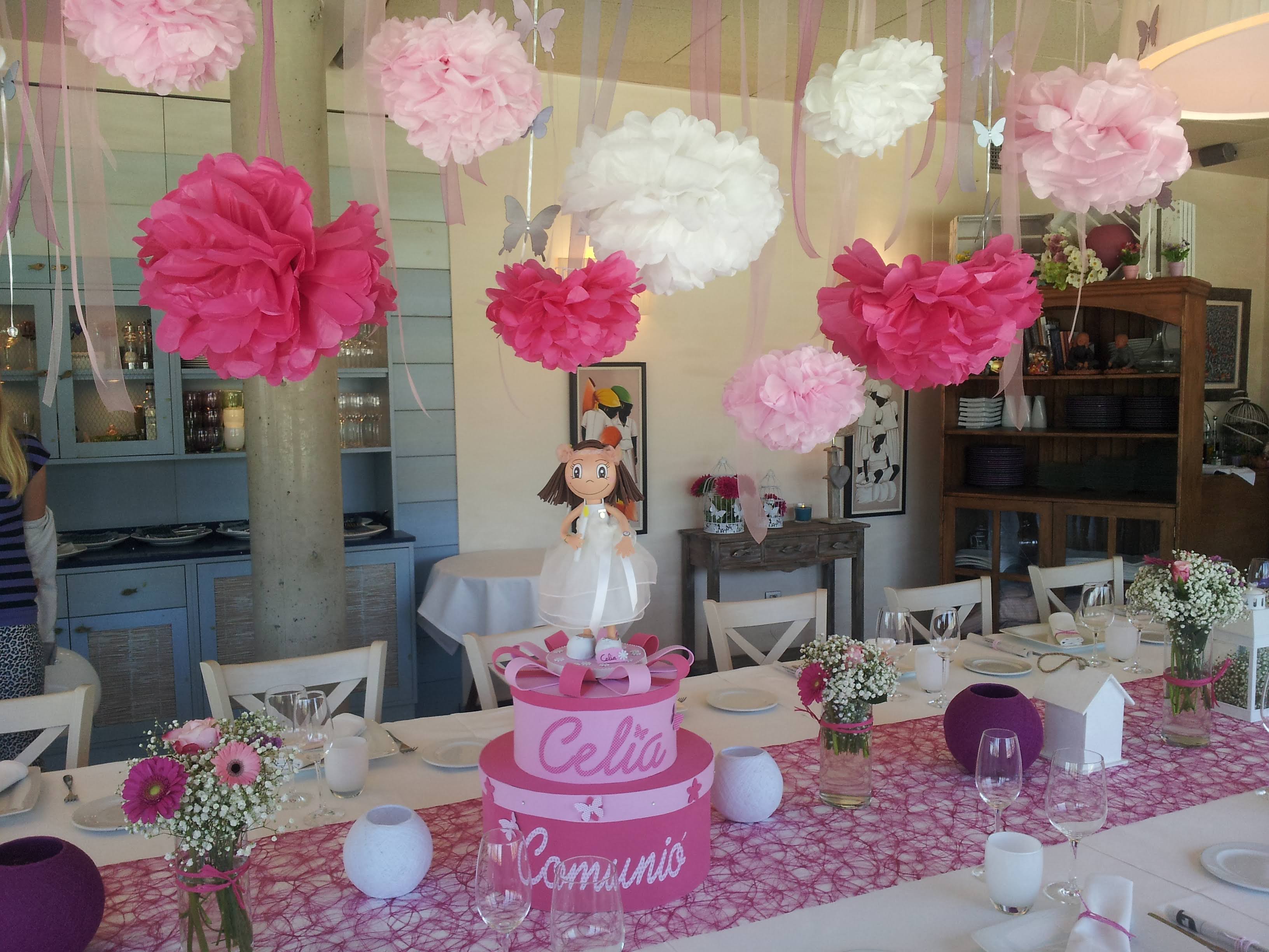 - Decoración aérea con pompones, cintas o mariposas, perfecta para salones grandes.