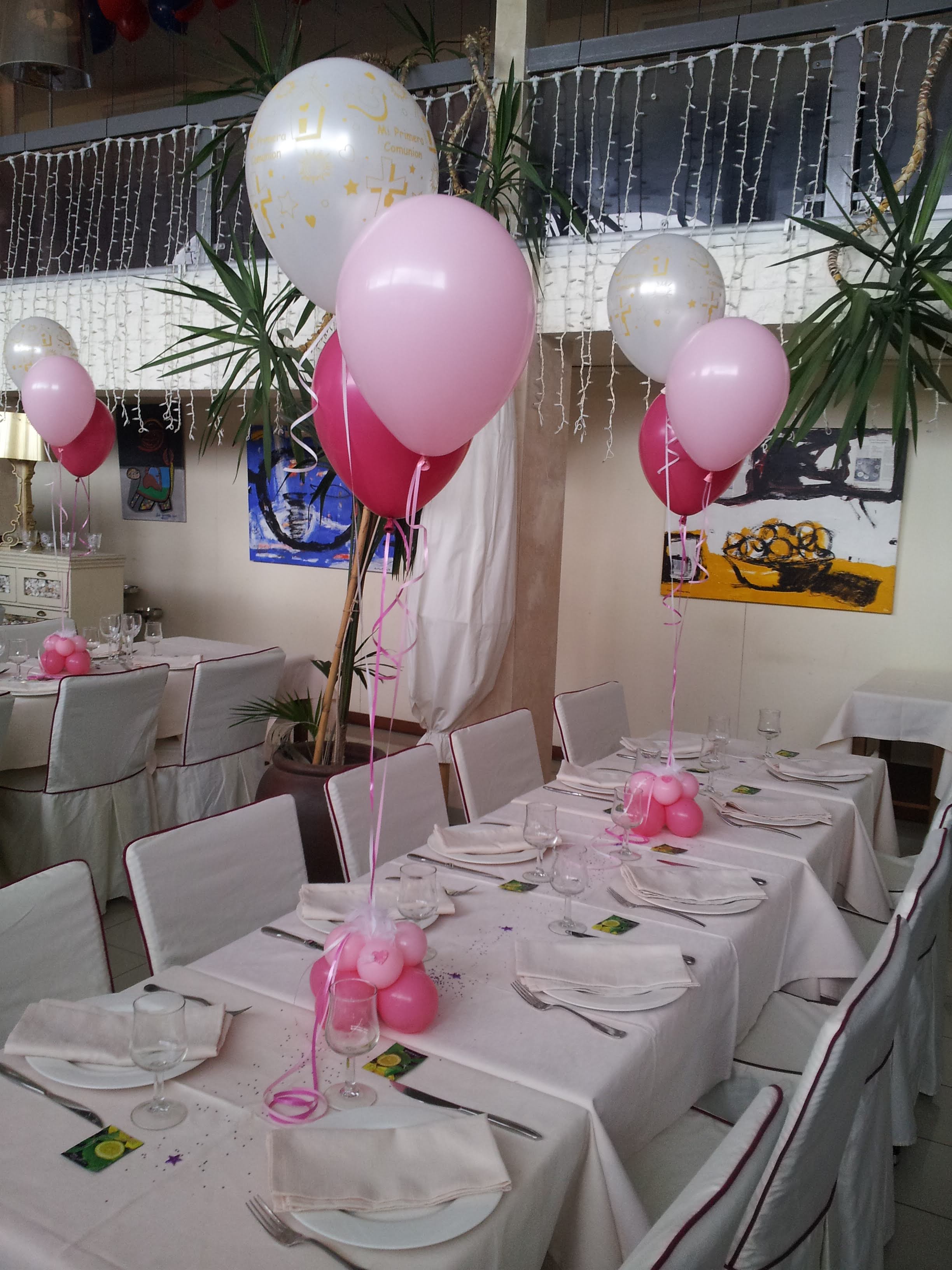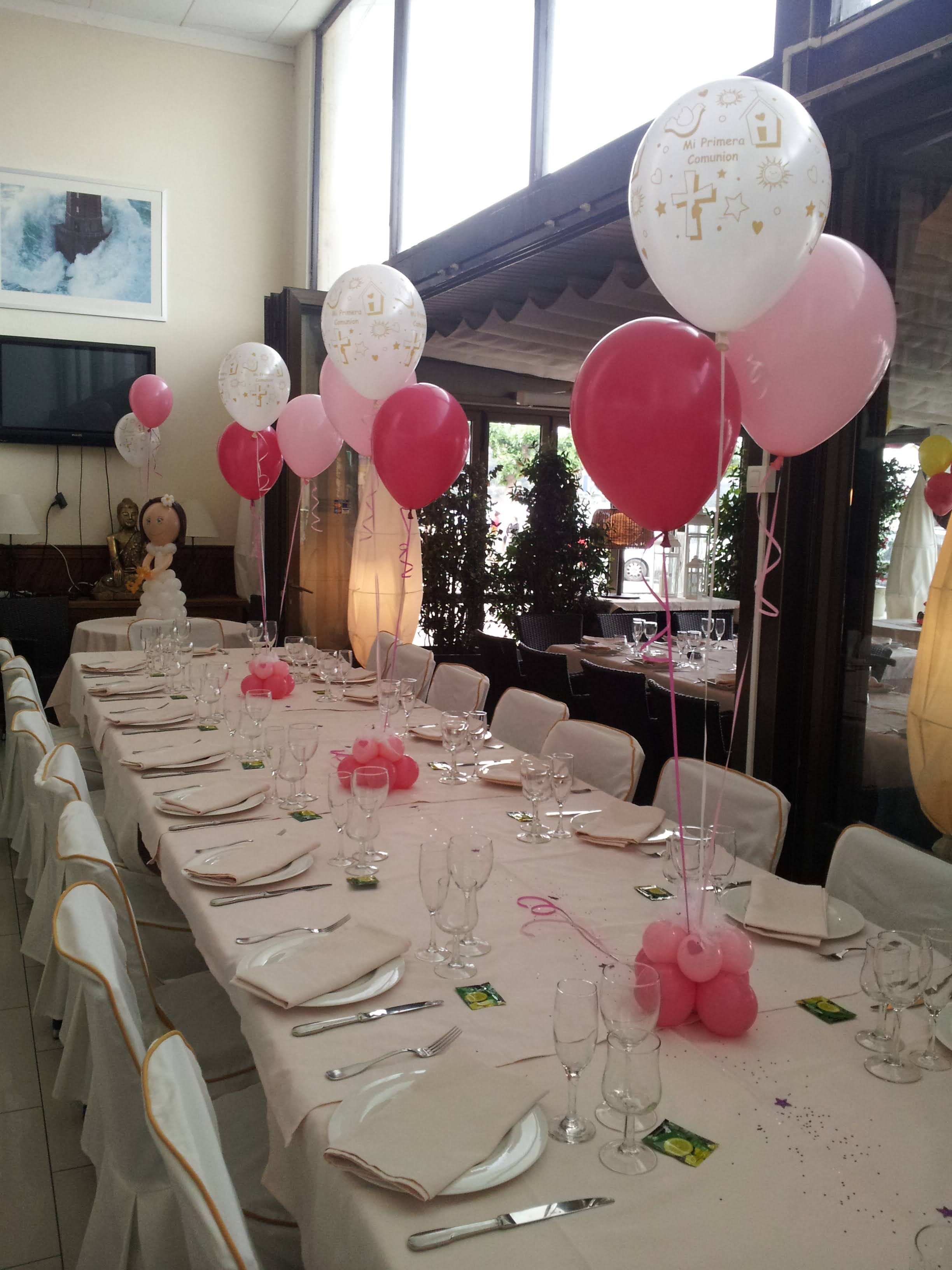 - Centros de mesa con globos de helio: combinaciones de 2 a 3 globos con un globo principal “Mi Primera Comunión”.