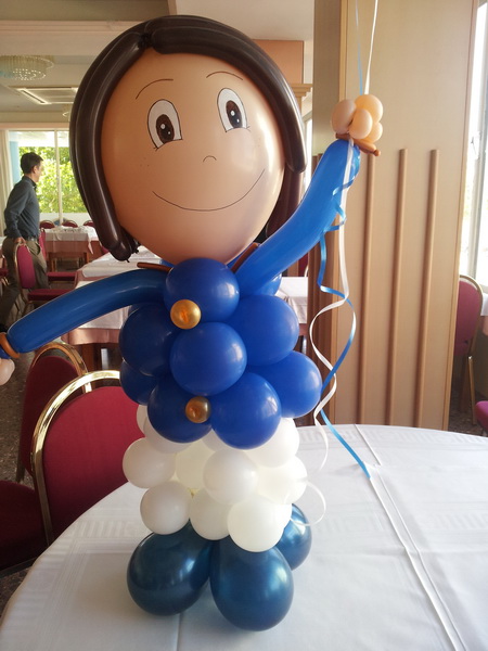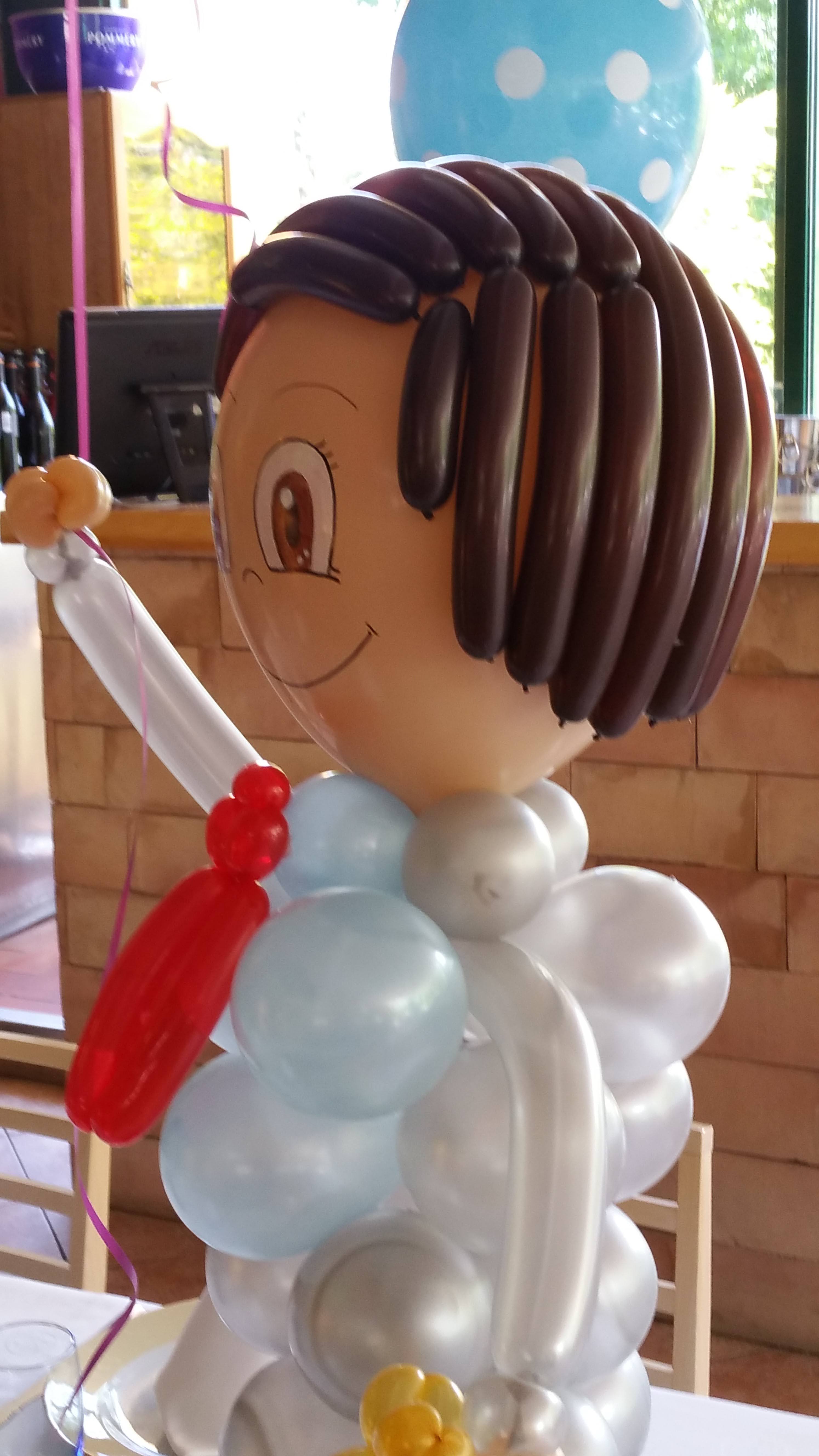 Uno de los elementos más queridos por las familias son nuestros muñecos de globos. Son figuras artesanales con rasgos dulces y un estilo muy personal, perfectas para colocar en la mesa principal o como centro protagonista. Podemos hacer tanto niño como niña, con vestido blanco, traje azul o combinaciones especiales.