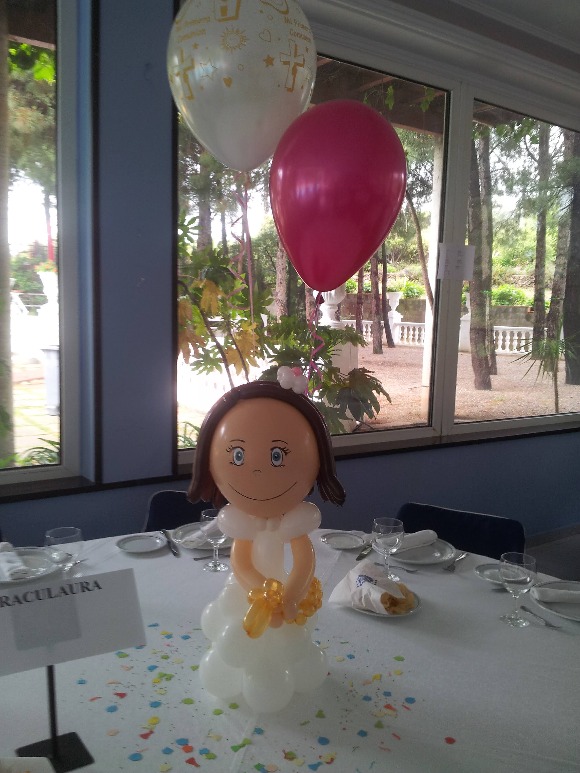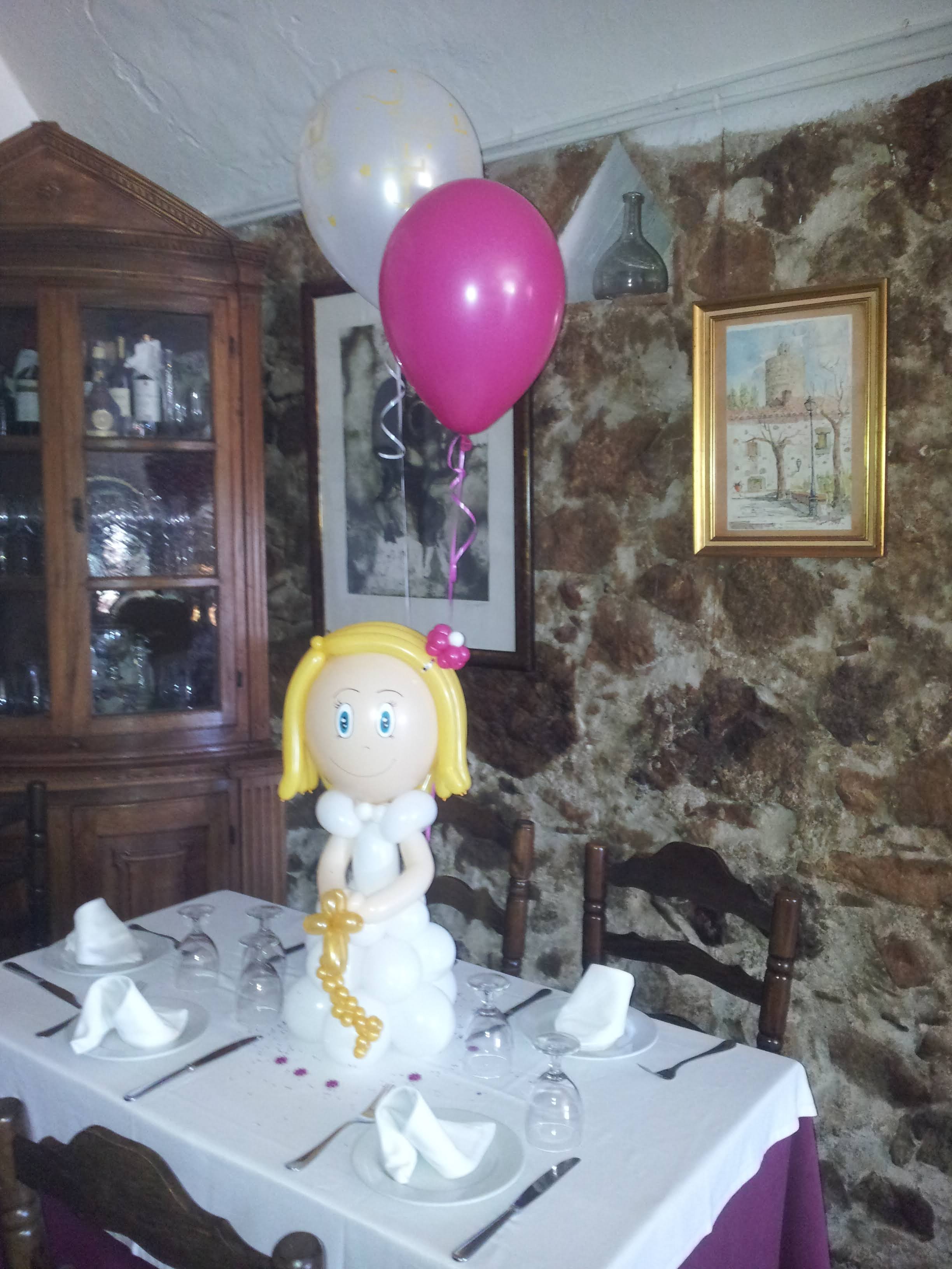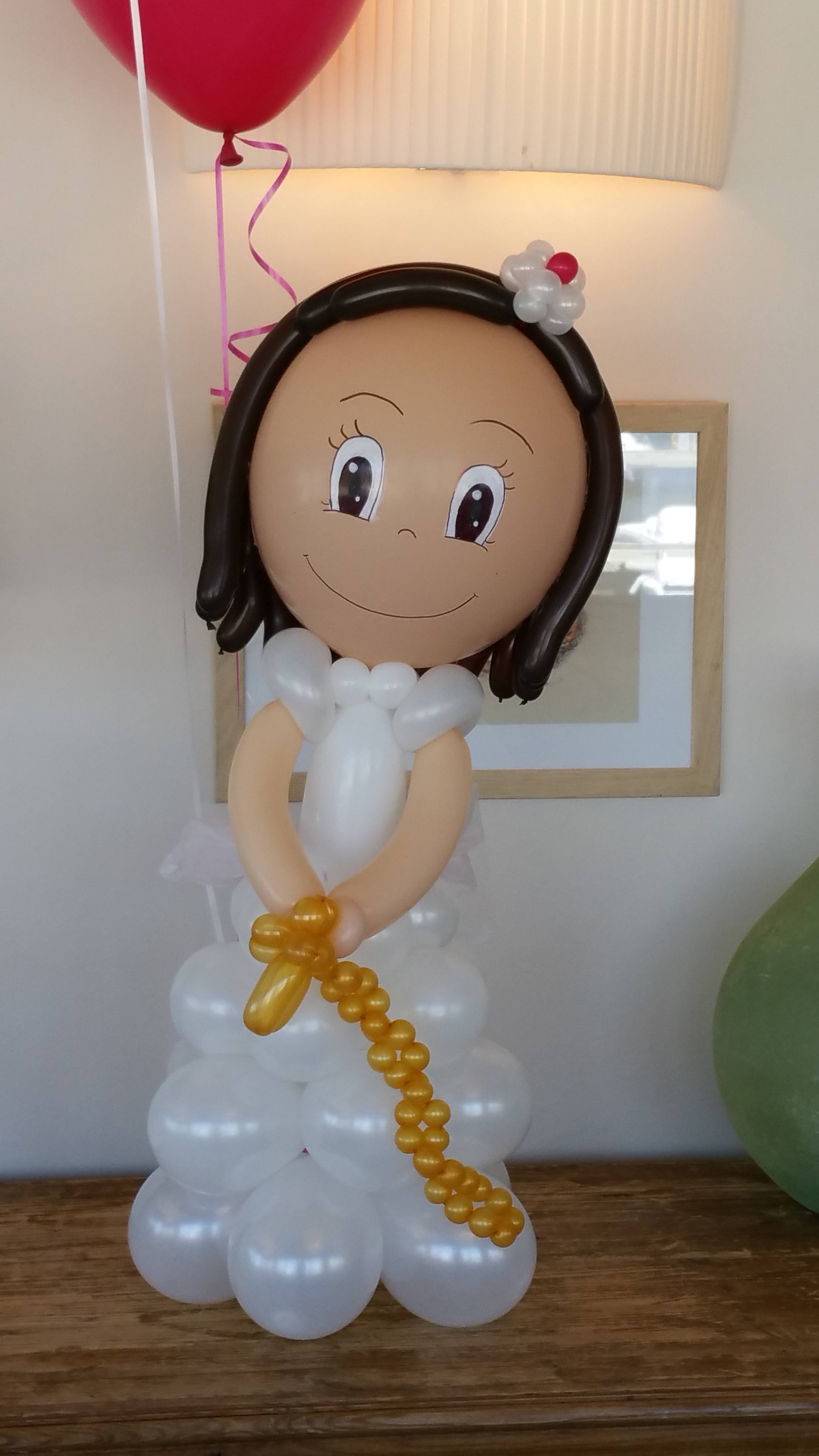 - Muñecos de globos hechos a mano (niño o niña), vestidos con traje o vestido blanco y un pequeño rosario.