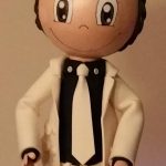 Las fofuchas de comunión personalizadas son uno de los encargos más especiales. Podemos crear niñas con vestidos blancos de encaje, coronas de flores y pequeños rosarios, así como niños con traje azul o blanco, corbata y detalles a juego. Son perfectas para colocar en la mesa principal, junto a la tarta o en un rincón destacado de la celebración, y se convierten en un recuerdo que acompaña al protagonista durante muchos años.